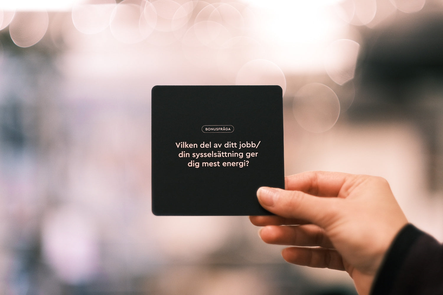 När ni spelat igenom de tre nivåerna men vill fortsätta så finns ett stort gäng bonusfrågor av blandad karaktär. Hur tror du att jag var i plugget? Vilken del av ditt jobb ger dig mest energi? Vad hos mig, som inte är fysiskt, attraherar dig mest? Ta en i taget eller välj ut de som känns extra spännande för just er.